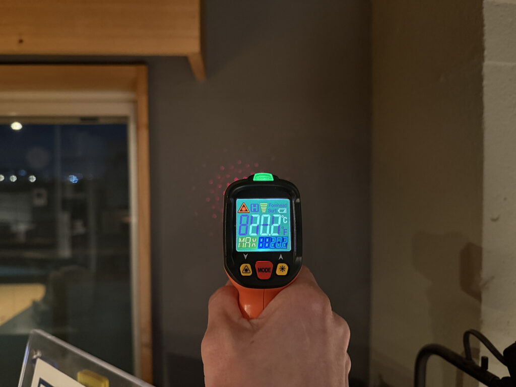 室温は19~20℃ぐらい(暖房設定温度20.5~21.5℃)ですが、無断熱とした外壁面(RC素地+ガイナ塗装)の温度は17.4℃となっています。